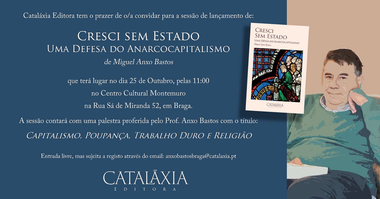 Pela primeira vez, Portugal terá a oportunidade única de ouvir e ver ao vivo Miguel Anxo Bastos, o carismático professor e pensador galego que se tornou uma referência no libertarianismo radical. Num evento inédito, Bastos marcará presença para uma conferência especial por ocasião do lançamento do seu livro Cresci sem Estado: Em Defesa do Anarcocapitalismo, publicado pela Cataláxia Editora. Esta obra monumental reúne uma selecção dos seus principais escritos, abrangendo temas tão diversos quanto profundos: da filosofia política à economia, das políticas de defesa à ciência, da história aos desafios sociais e até à religião. Mais do que uma mera colectânea do seu pensamento, o livro é uma verdadeira enciclopédia do anarcocapitalismo, concebida tanto para iniciantes que desejam compreender os fundamentos desta filosofia como para leitores experientes em busca de reflexões incisivas. Fiel ao seu estilo provocador e lógico, Bastos condensa nesta obra os pilares da sua visão: um mundo sem Estado, onde a liberdade individual, o mercado voluntário e a responsabilidade pessoal reinam supremos. A conferência promete ser um momento de debate vibrante, oferecendo aos portugueses a oportunidade de interagir directamente com um dos maiores defensores contemporâneos do livre mercado e da autonomia individual. Não perca esta oportunidade de mergulhar no universo do anarcocapitalismo com um dos seus mais eloquentes porta-vozes.