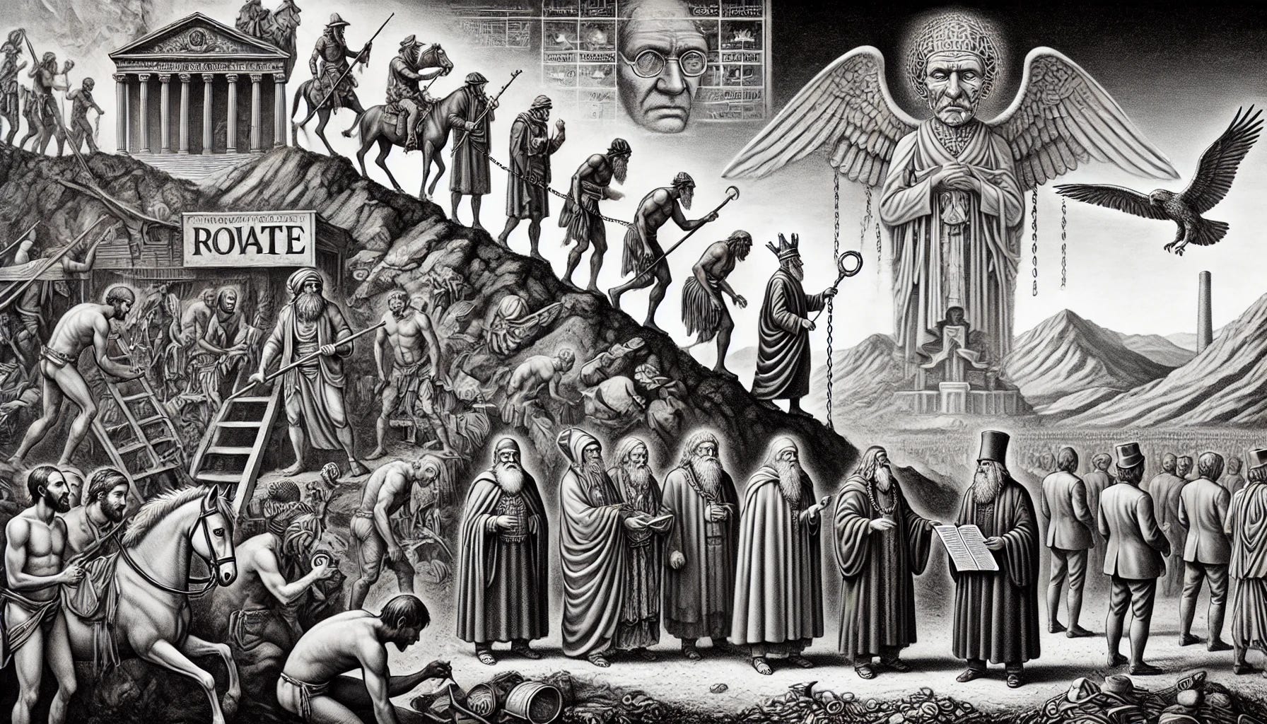 Com o passar do tempo, essa simpática extorsão começou a revelar-se trabalhosa. Manter os camponeses obedientes era um esforço, uma verdadeira canseira; pior, sempre havia o risco de uma revolução — poderiam matar os nobres bandidos! Que horror! Foi então que surgiu a brilhante ideia: criar um aparato ideológico. Poetas, filósofos, escritores, trovadores e arquitectos, todos dedicados a justificar o poder. Ou, se a coisa ficasse mais sofisticada, até uma casta sacerdotal, como na Roma Antiga, para dar aquele toque divino à opressão. O Estado deixara de ser apenas um assalto institucionalizado e transformou-se numa verdadeira obra de arte, onde o poder se justificava pelo divino.