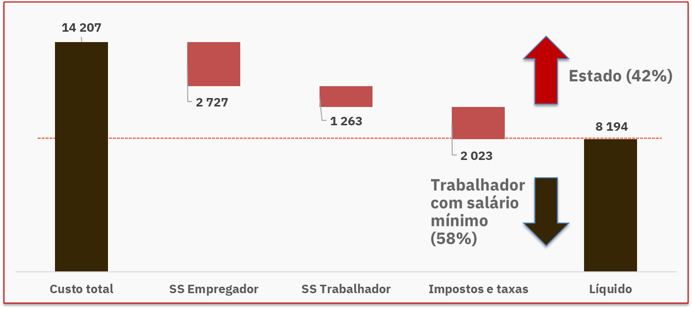 Por outro lado, sobre o salário bruto do trabalhador incide 11% de segurança social, ou seja, 1.263€. Tendo em conta os impostos e taxas supra detalhados, que representam 2.023€ por ano, temos um salário líquido de apenas 8.278€ (ver Figura 3), cerca de 58%, enquanto para o Estado seguem 42%!
