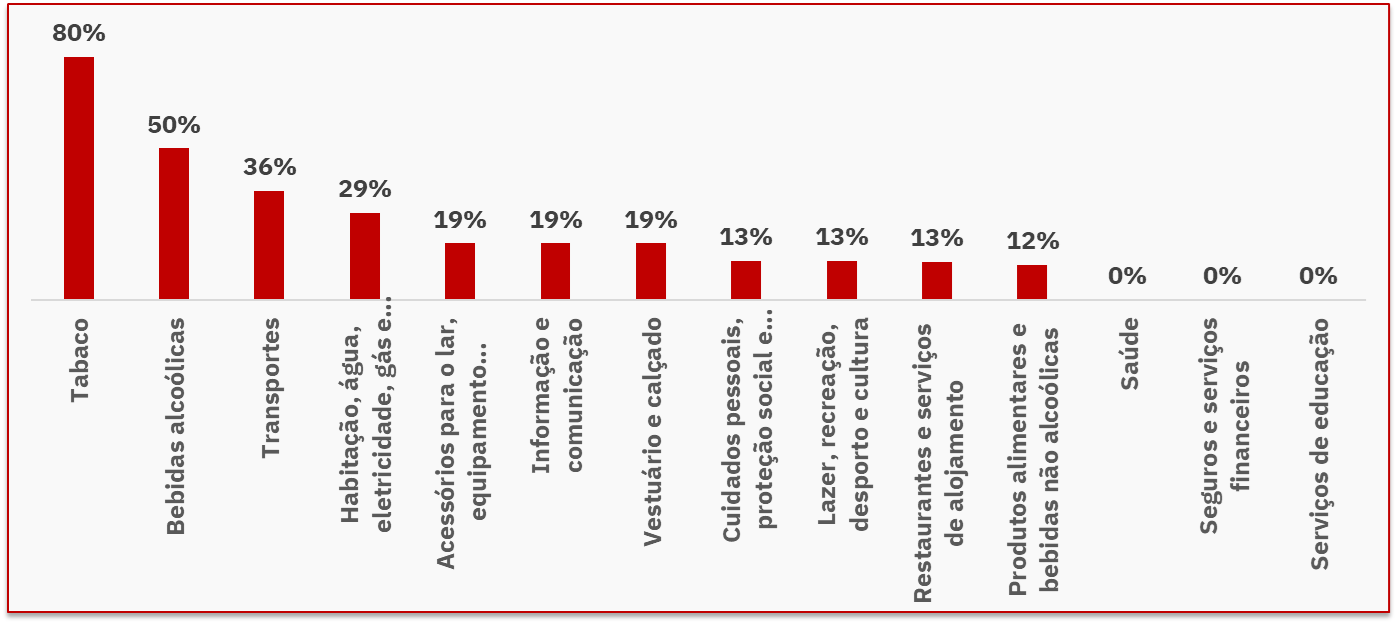 Aqui, importa destacar a extorsão praticada sobre o tabaco (80%), bebidas alcoólicas (50%) e transportes (36%). No caso da saúde, serviços financeiros e serviços de educação, apesar de existirem impostos (imposto de selo nos serviços financeiros), por uma questão de simplificação optou-se por 0%.