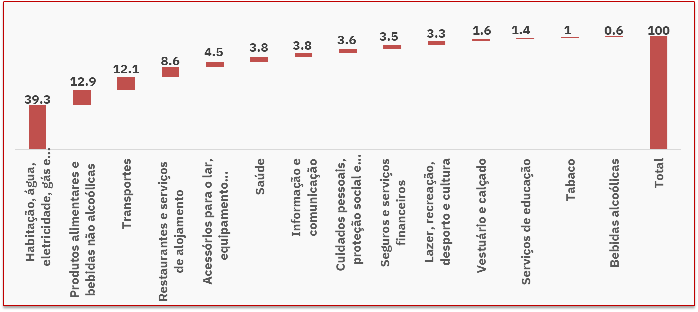 Segundo o inquérito do INE às despesas das famílias para o período 2022/2023, a despesa dos agregados familiares estava desagregada segundo a Figura 1.